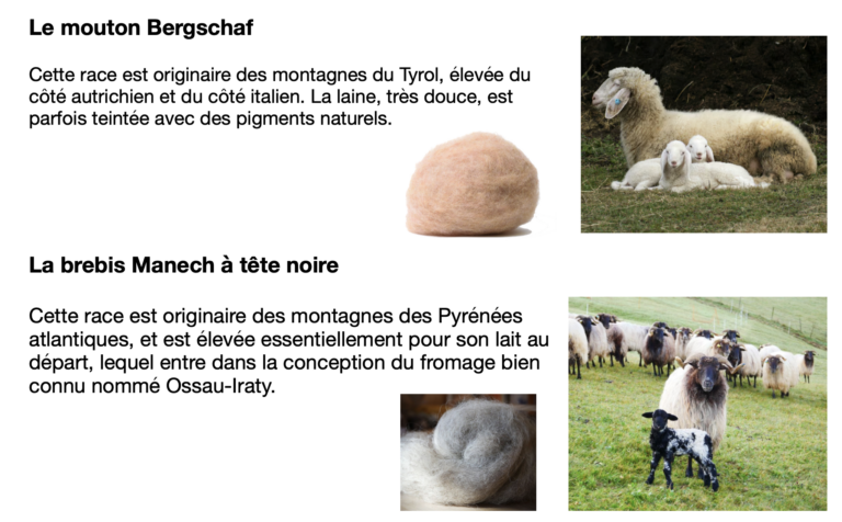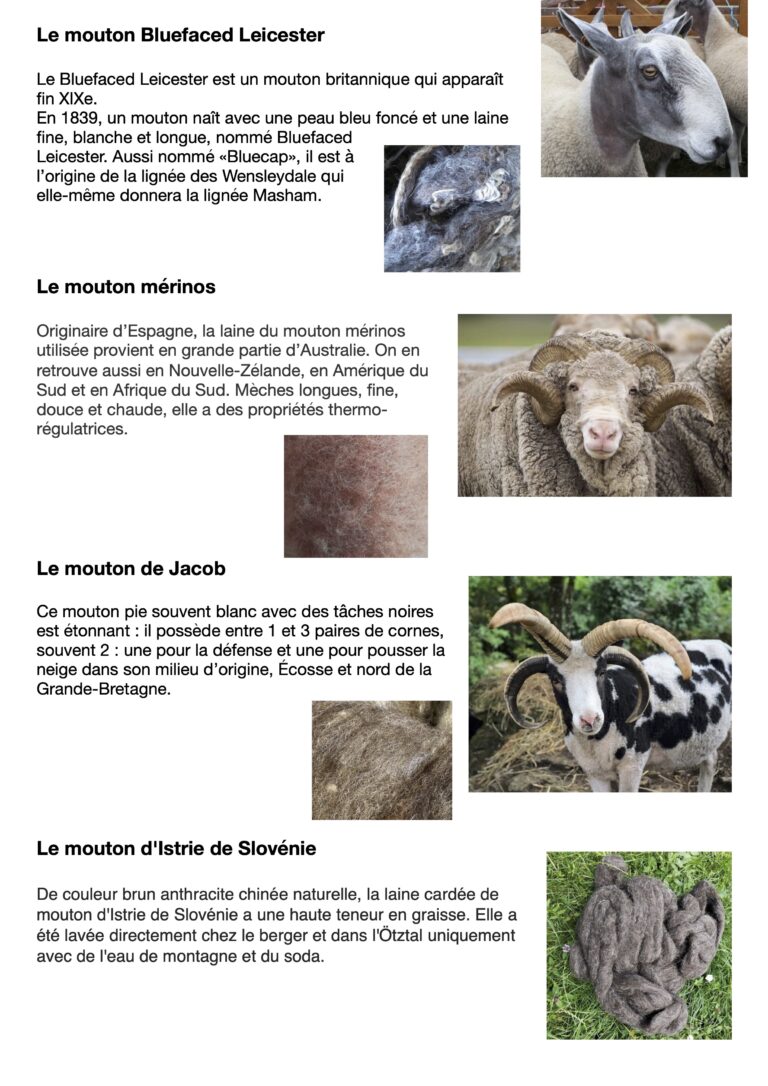 Chaque oeuvre de la série est une petite sculpture d’art composée de diverses laines cardées naturelles de mouton, bio ou provenant de petits éleveurs du monde entier qui aiment leurs bêtes et les respectent, les toisons étant récoltées, lavées et cardées. Ces laines bio ou quasi bio coûtent cher, entre 50€ et 400€ le kilo…