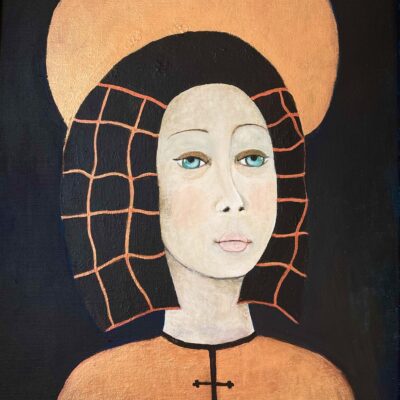 Sur fond de bleu outremer et de dégradés bleu canard, Abigaël, ancien prénom d’origine hébraïque, est une femme élancée au visage souriant qui se dresse avec sa longue tunique aux reflets de cuivre rouge et doré. Elle porte sur la tête un turban crème aux divers reflets enroulé sur lui-même telle une arabesque en chantilly…