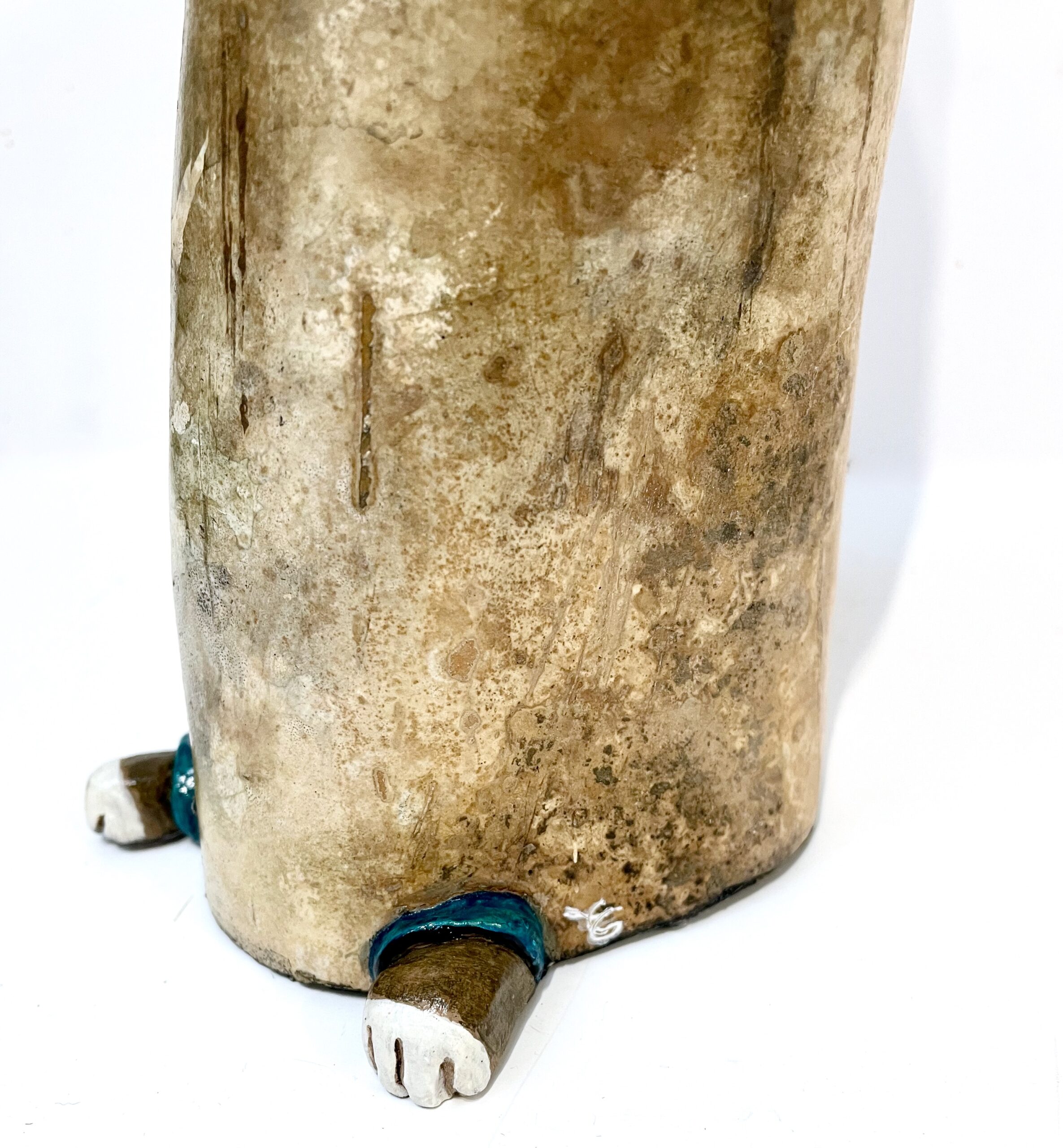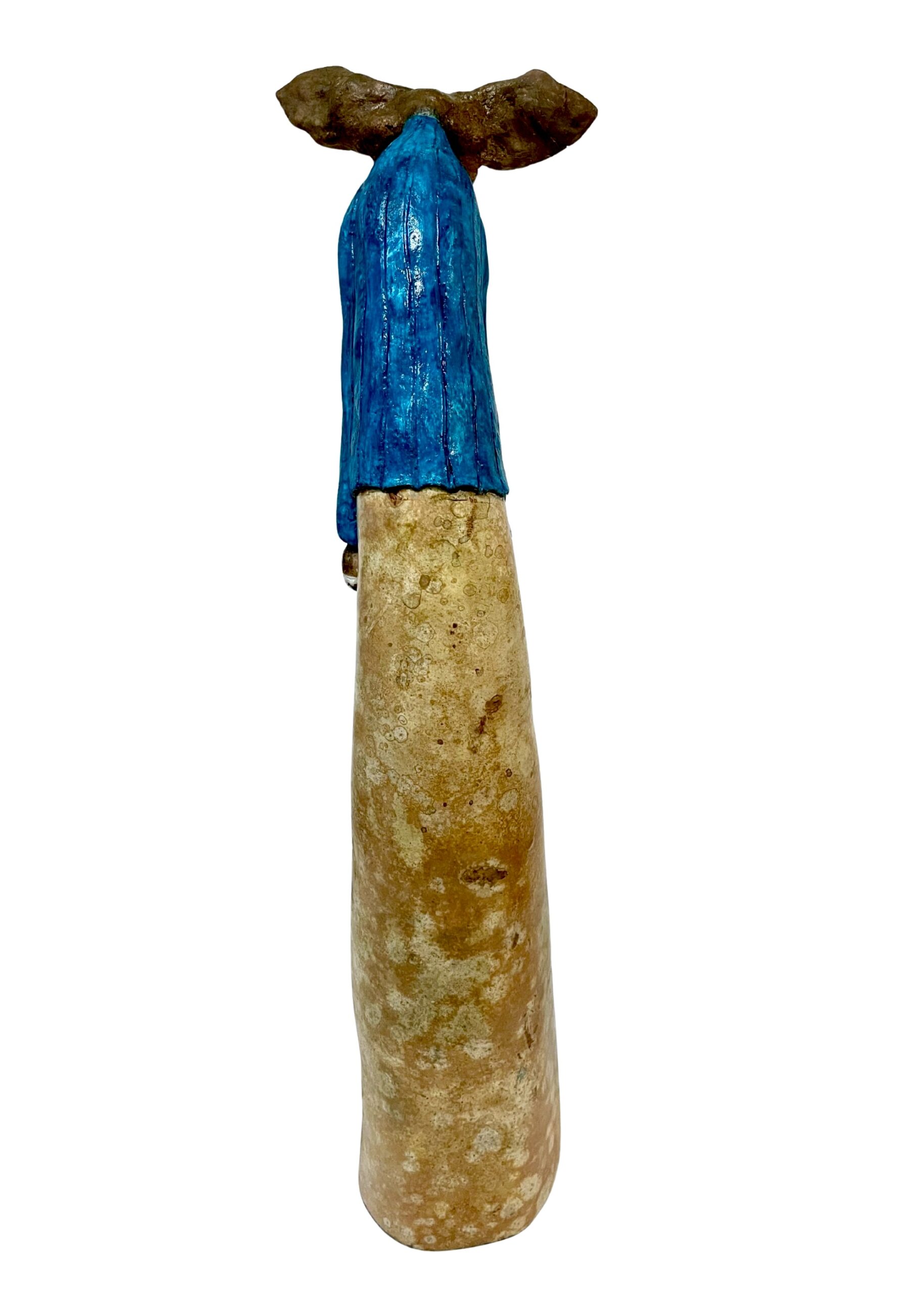 Il porte un long pull côtelé bleu paon, et le reste de son corps, en bois de calebasse naturel, ressemble à une longue robe.