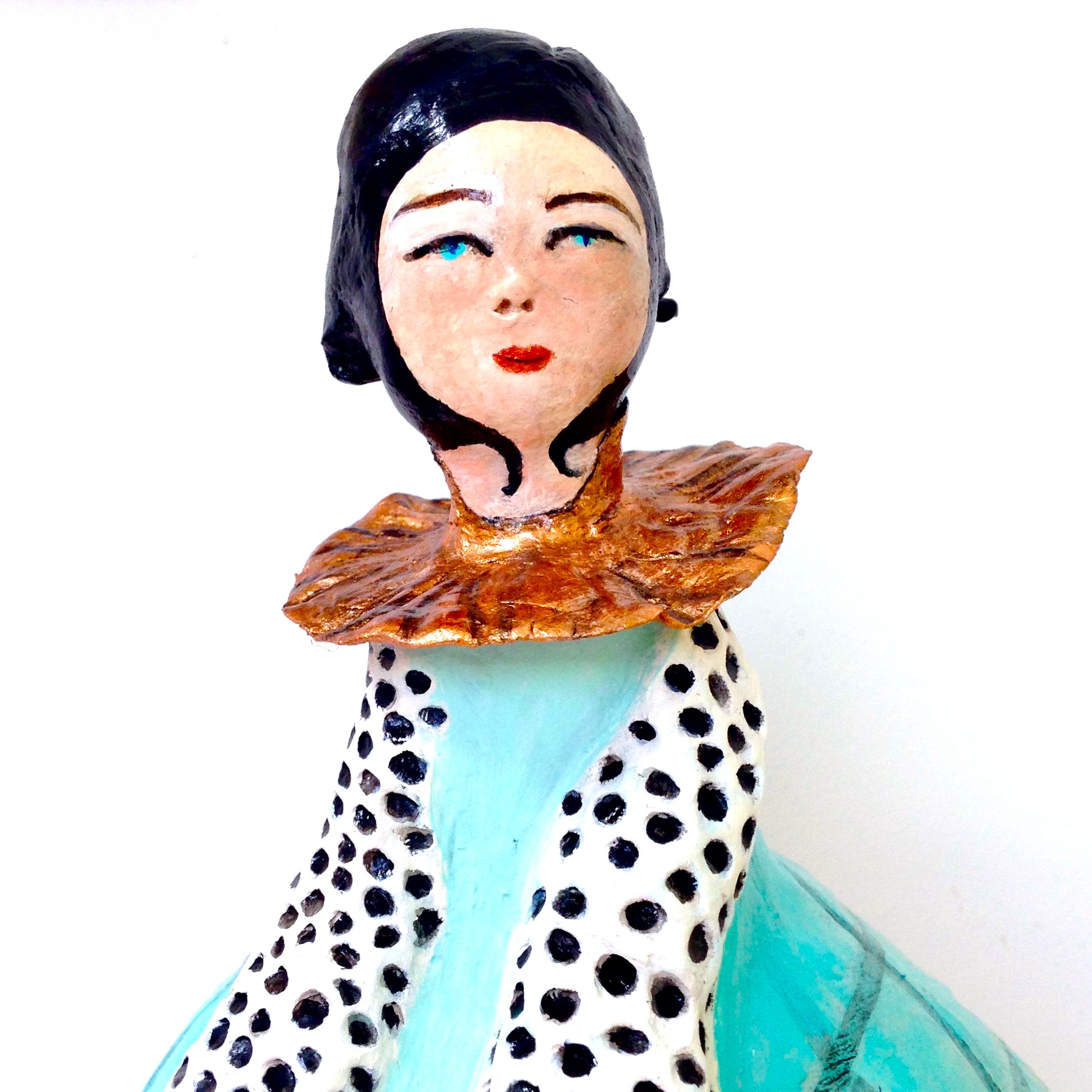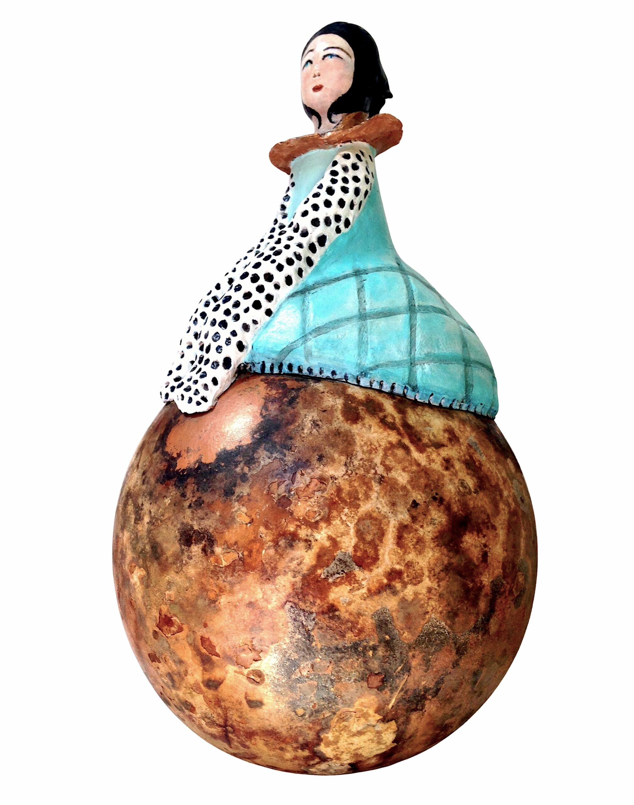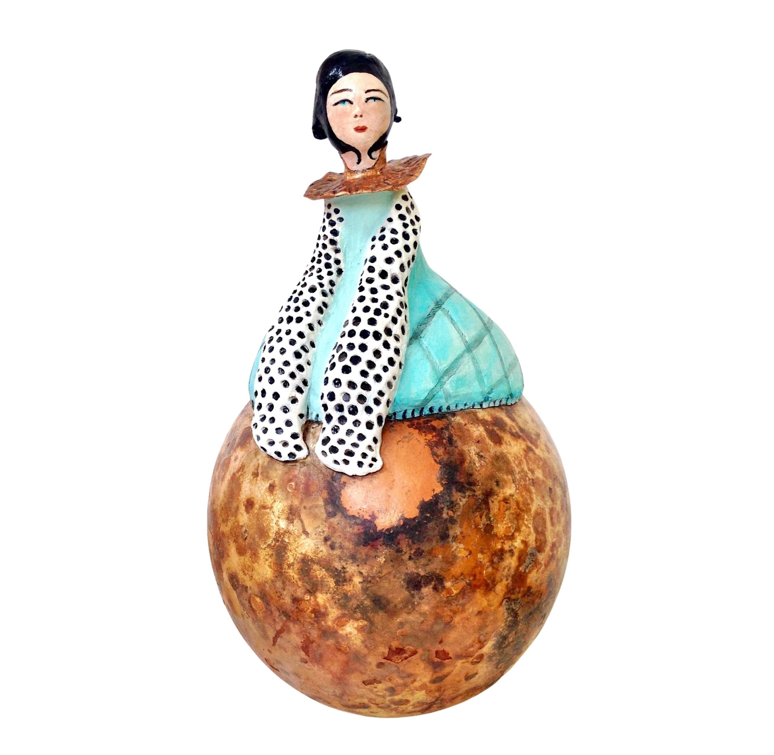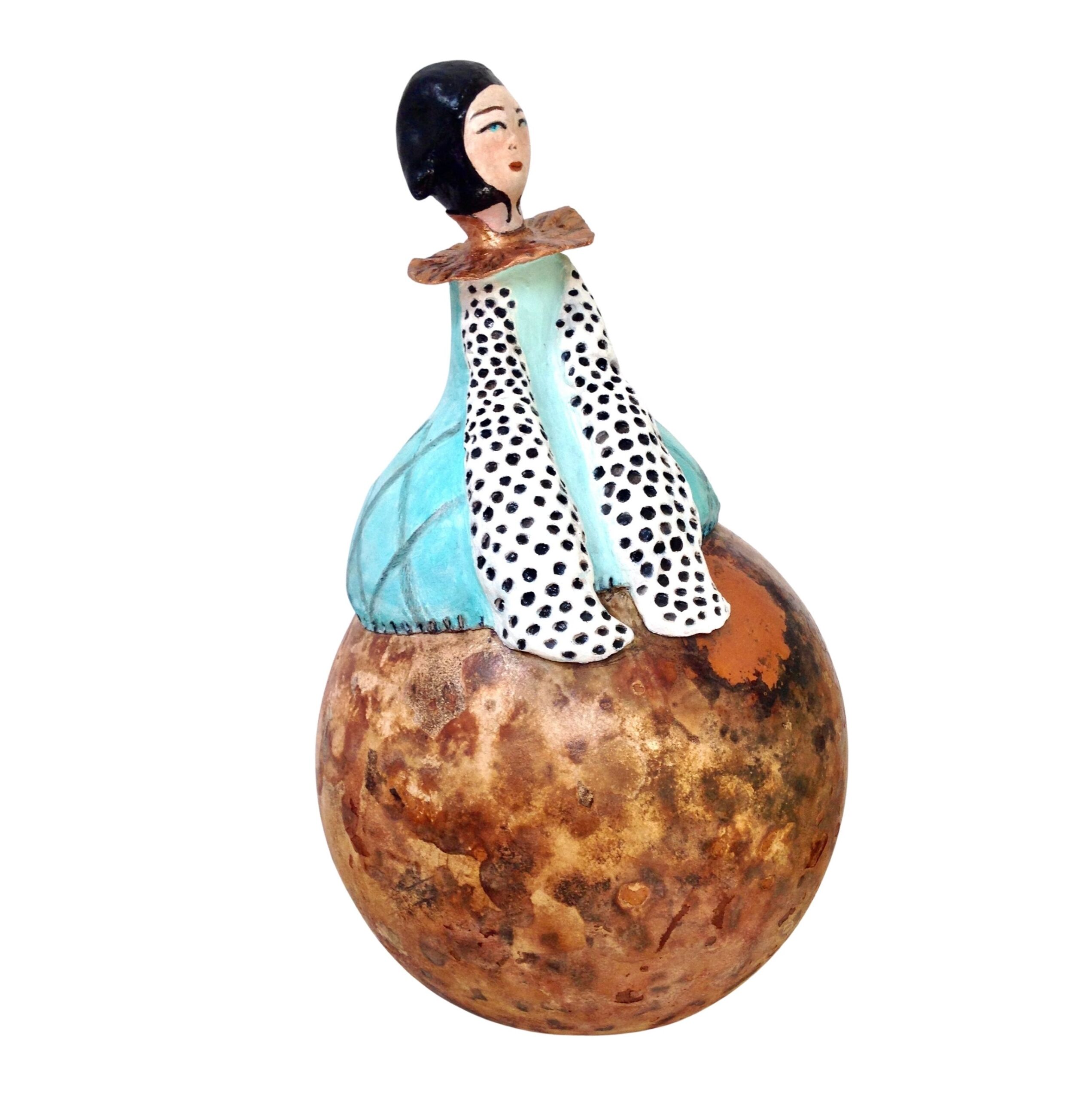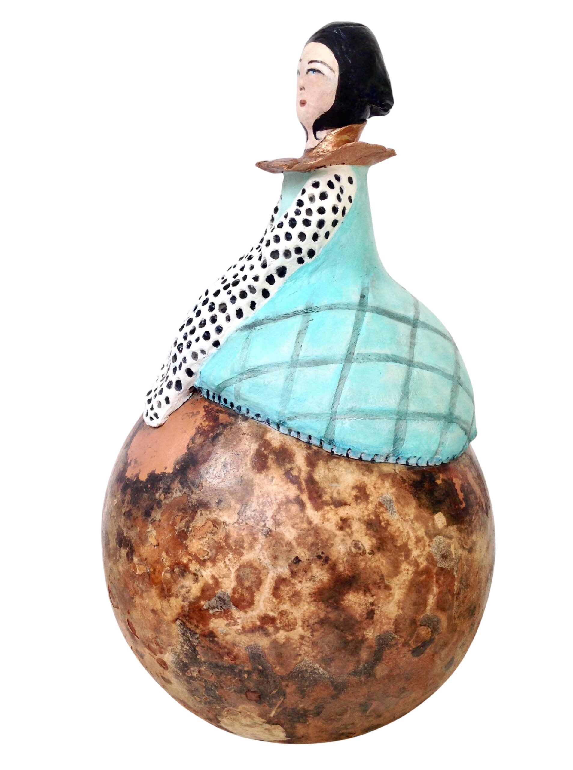 Matériau : bois de calebasse séché, cellulose de bois de surfine, peinture acrylique, vernis de protection.
