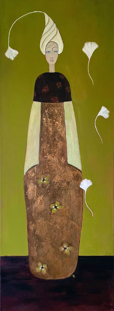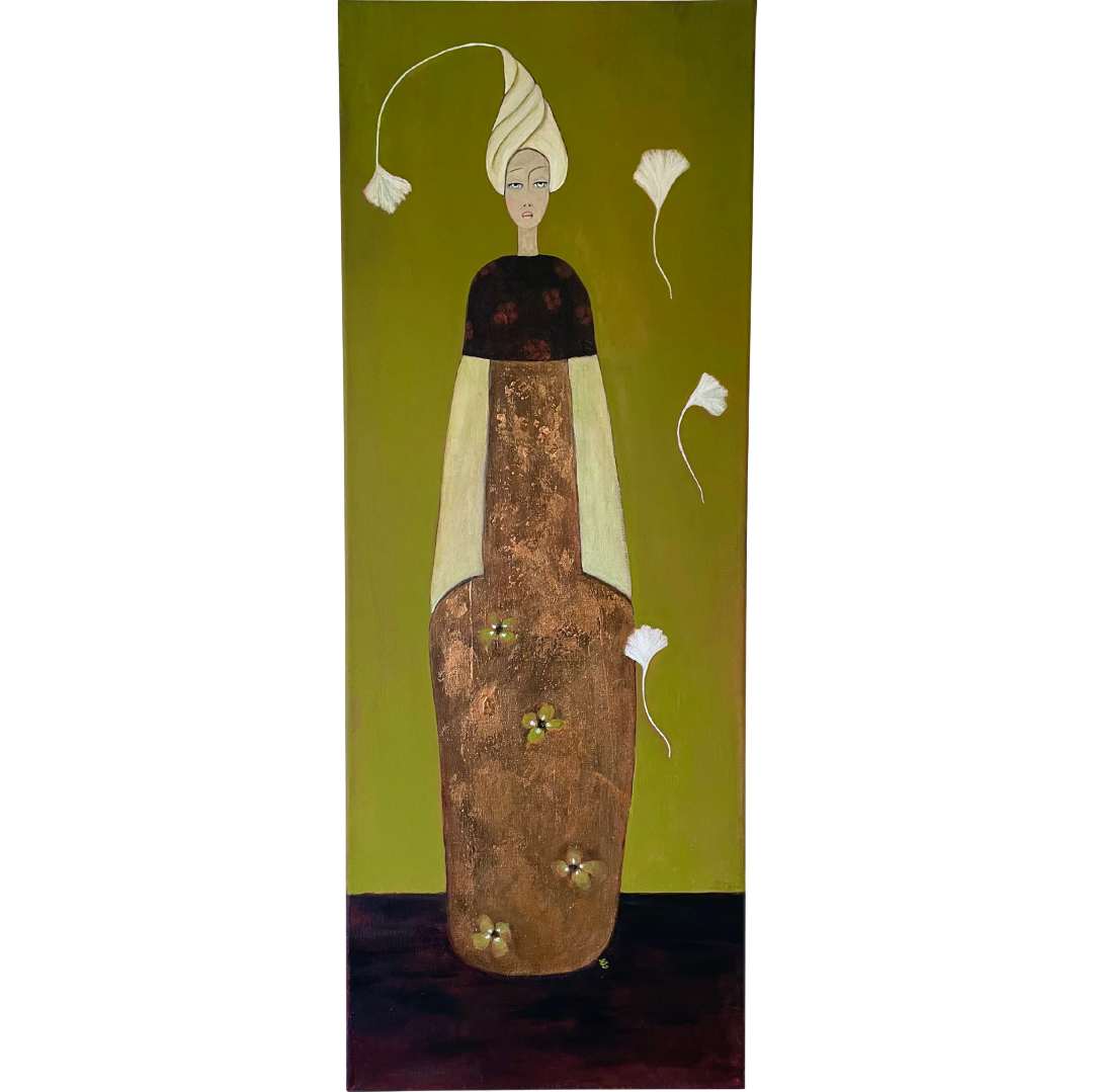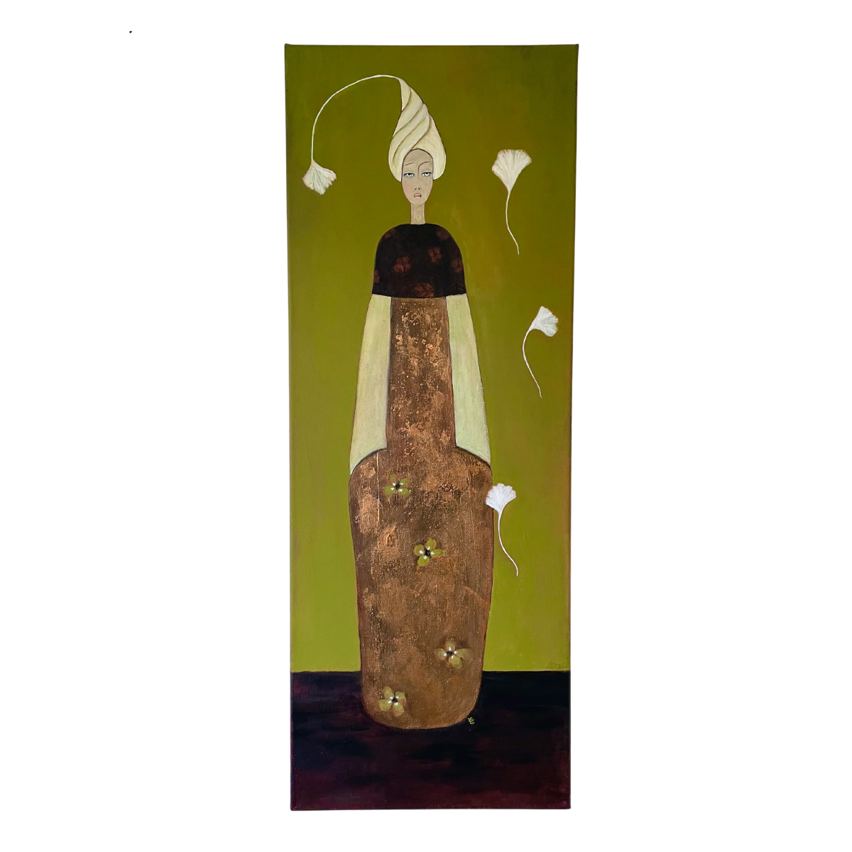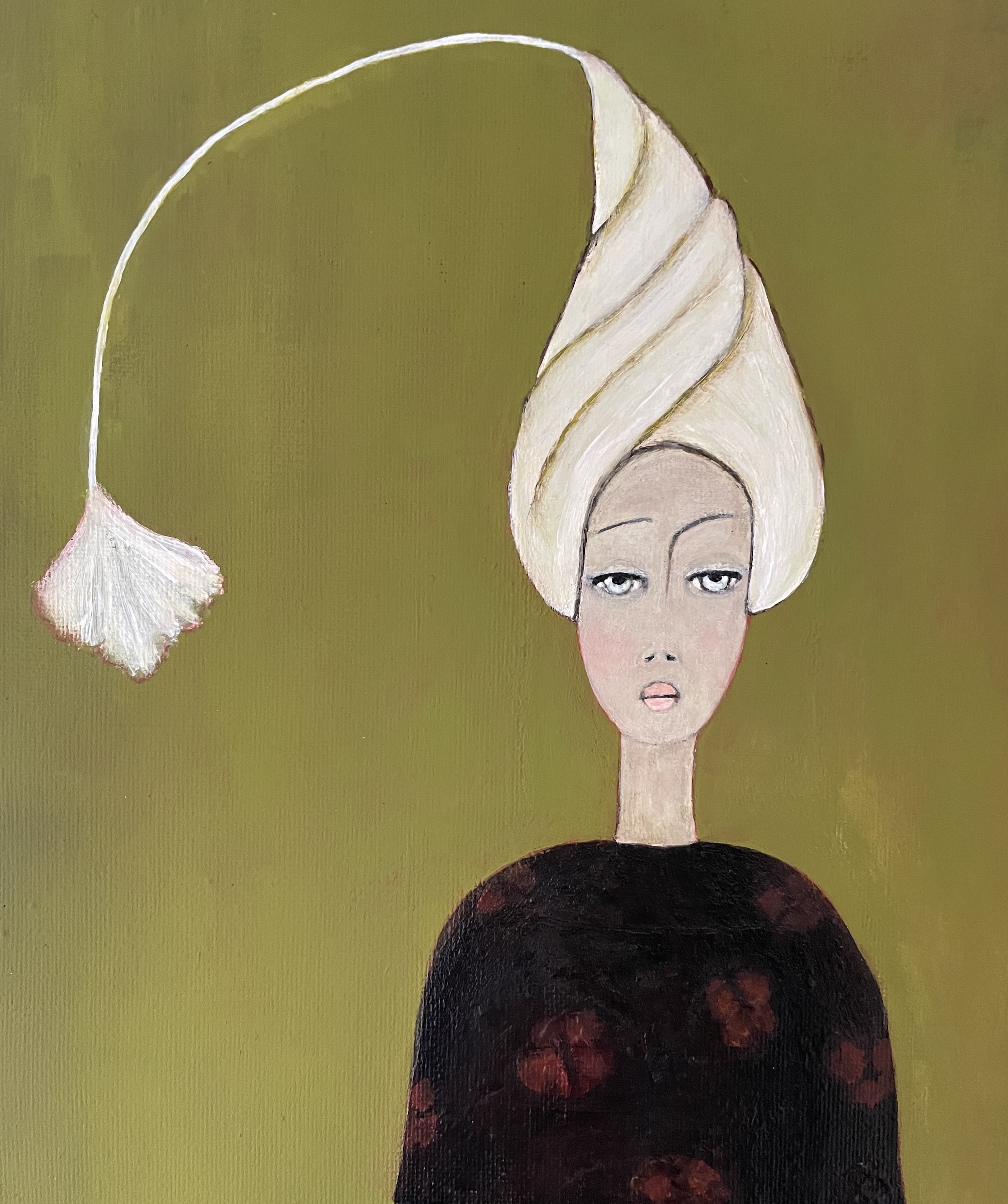 En arrière plan, quelques fleurs blanches flottent sur un mur d’un vert olive lumineux, l’une d’elle terminant comme une breloque la coiffe au turban couleur brume du matin de Dame nature.