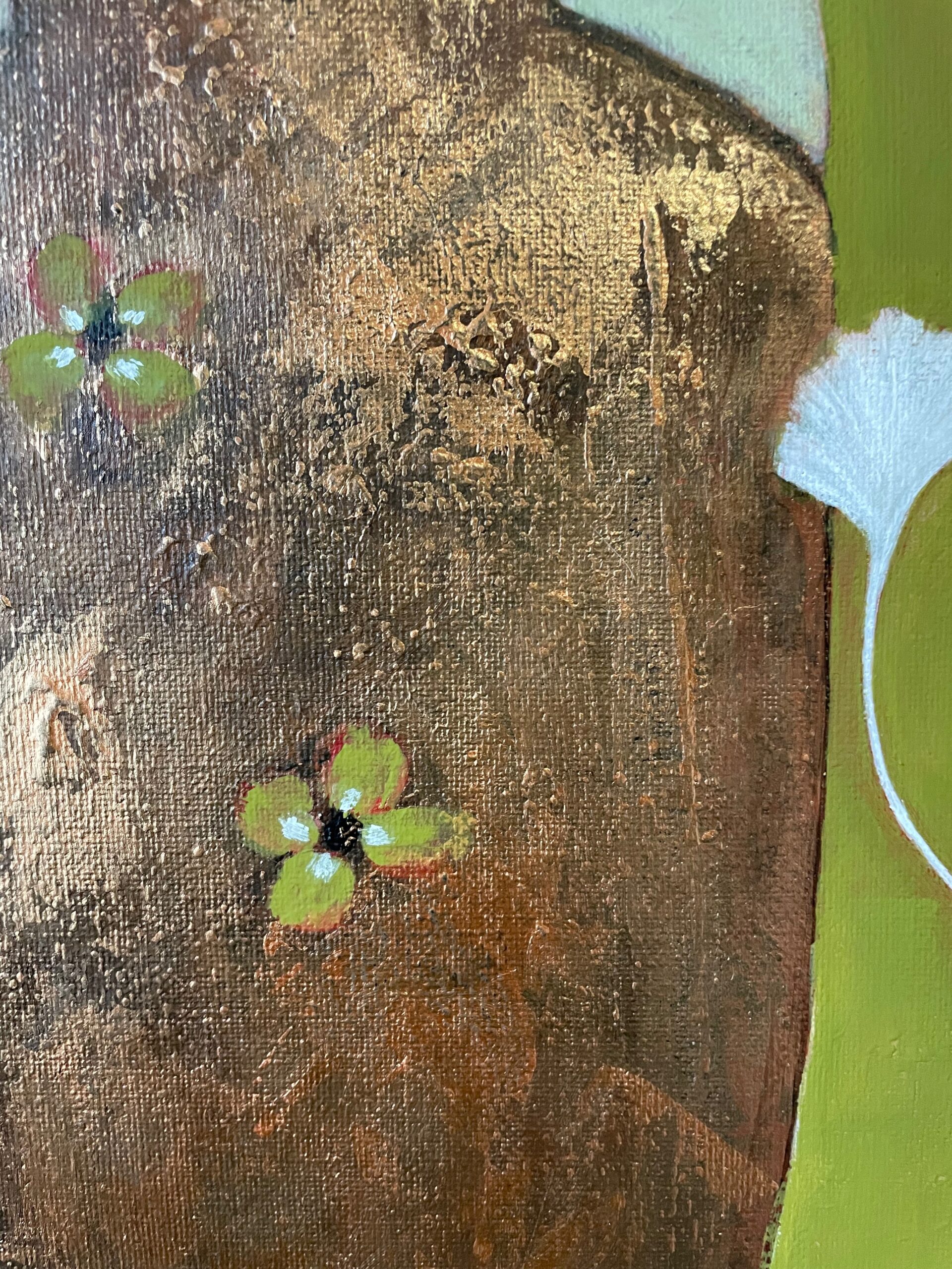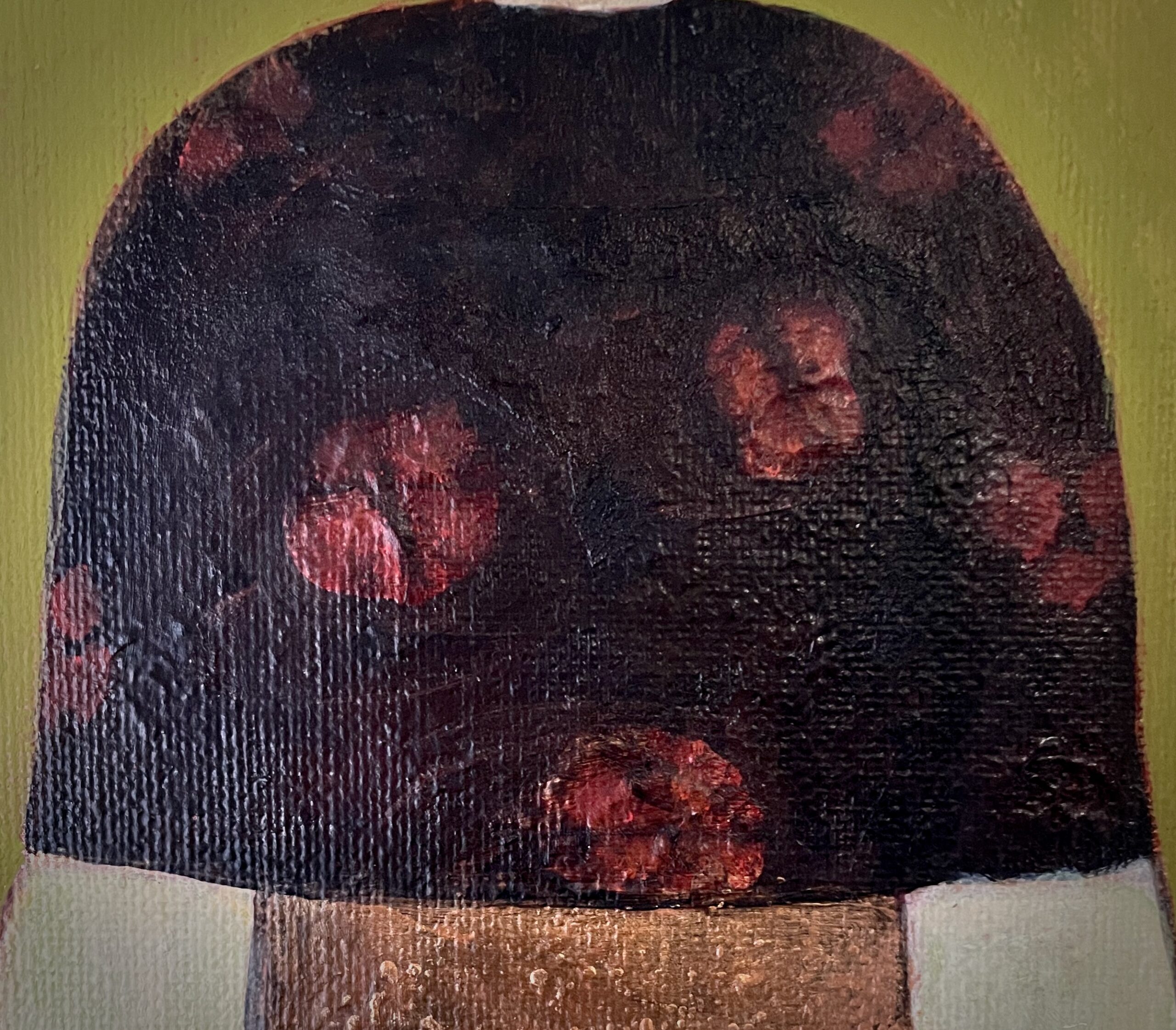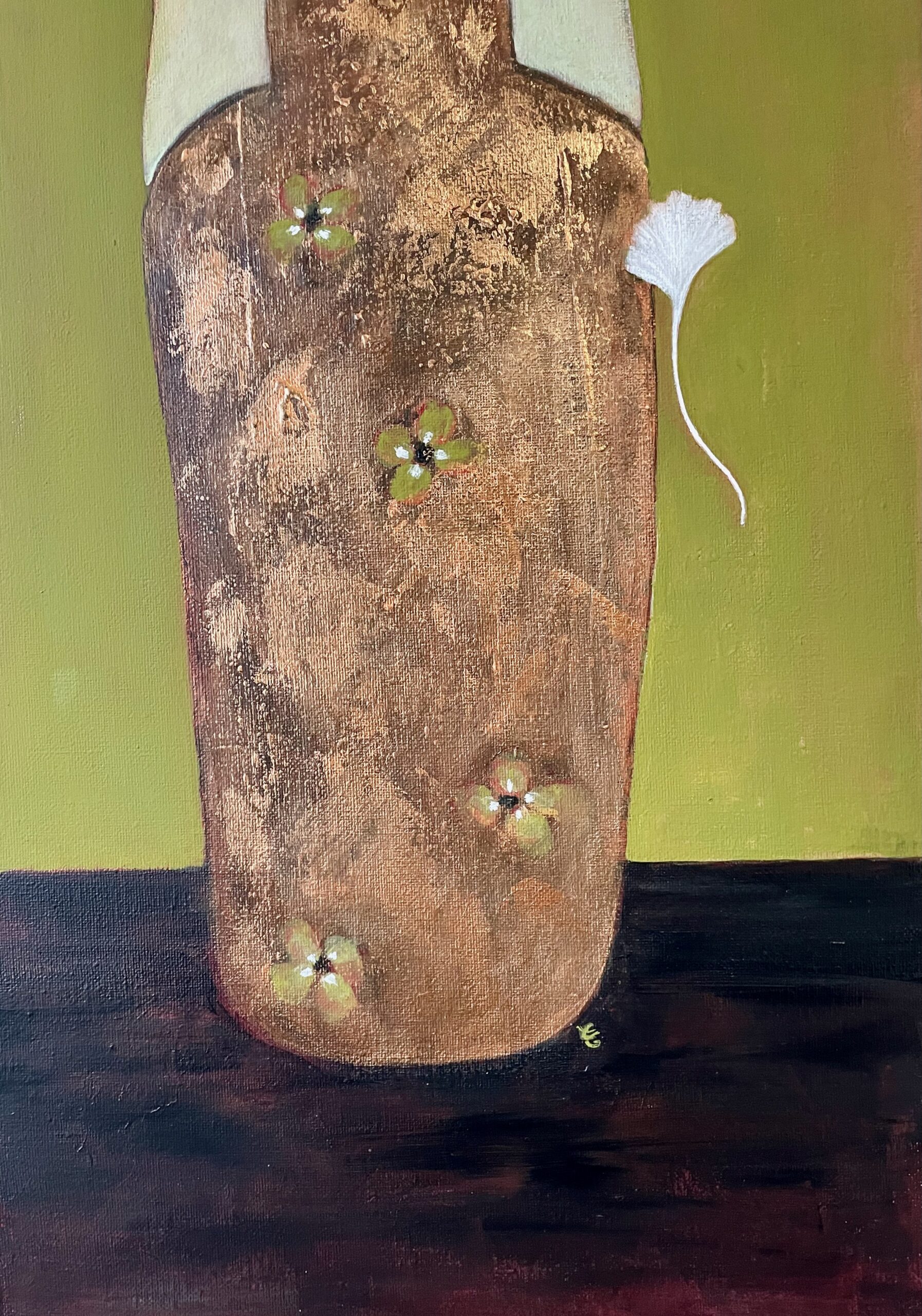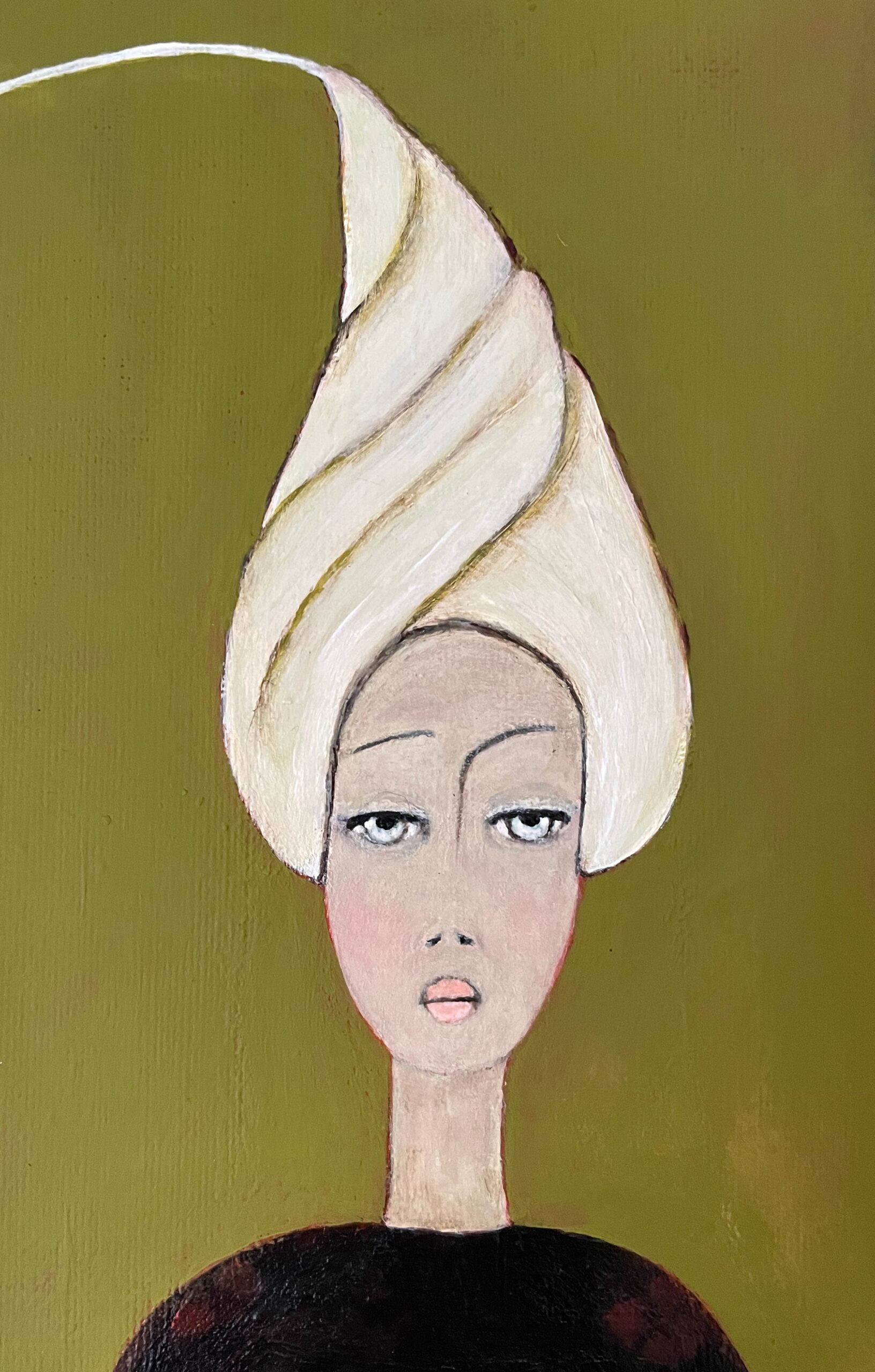 En arrière plan, quelques fleurs blanches flottent sur un mur d’un vert olive lumineux, l’une d’elle terminant comme une breloque la coiffe au turban couleur brume du matin de Dame nature.