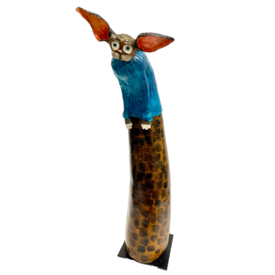 Elle est réalisée en cellulose de bois surfine sur fond de bois de calebasse et peinte à l’acrylique et à l’huile hydrosoluble vernie.